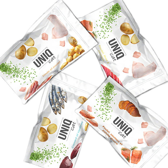 Composition | Canard & Sardines, Dinde & Poulet, Poulet, Thon & Saumon, Poulet & Saumon (chaton) |